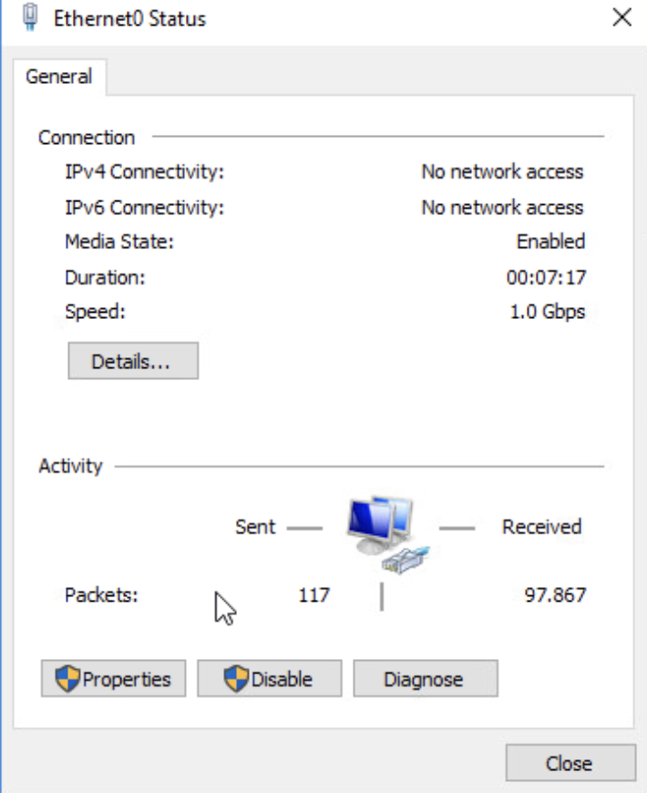 Ethernet0 bağlantısına tıkladıktan sonra açılan pencerede 'Properties' (Özellikler) butonuna tıklıyoruz. Bu adım, ağ bağdaştırıcısının yapılandırma ayarlarına erişmemizi sağlar. Buradan IP adresi, DNS ve diğer ağ ayarlarını yapılandırabiliriz.