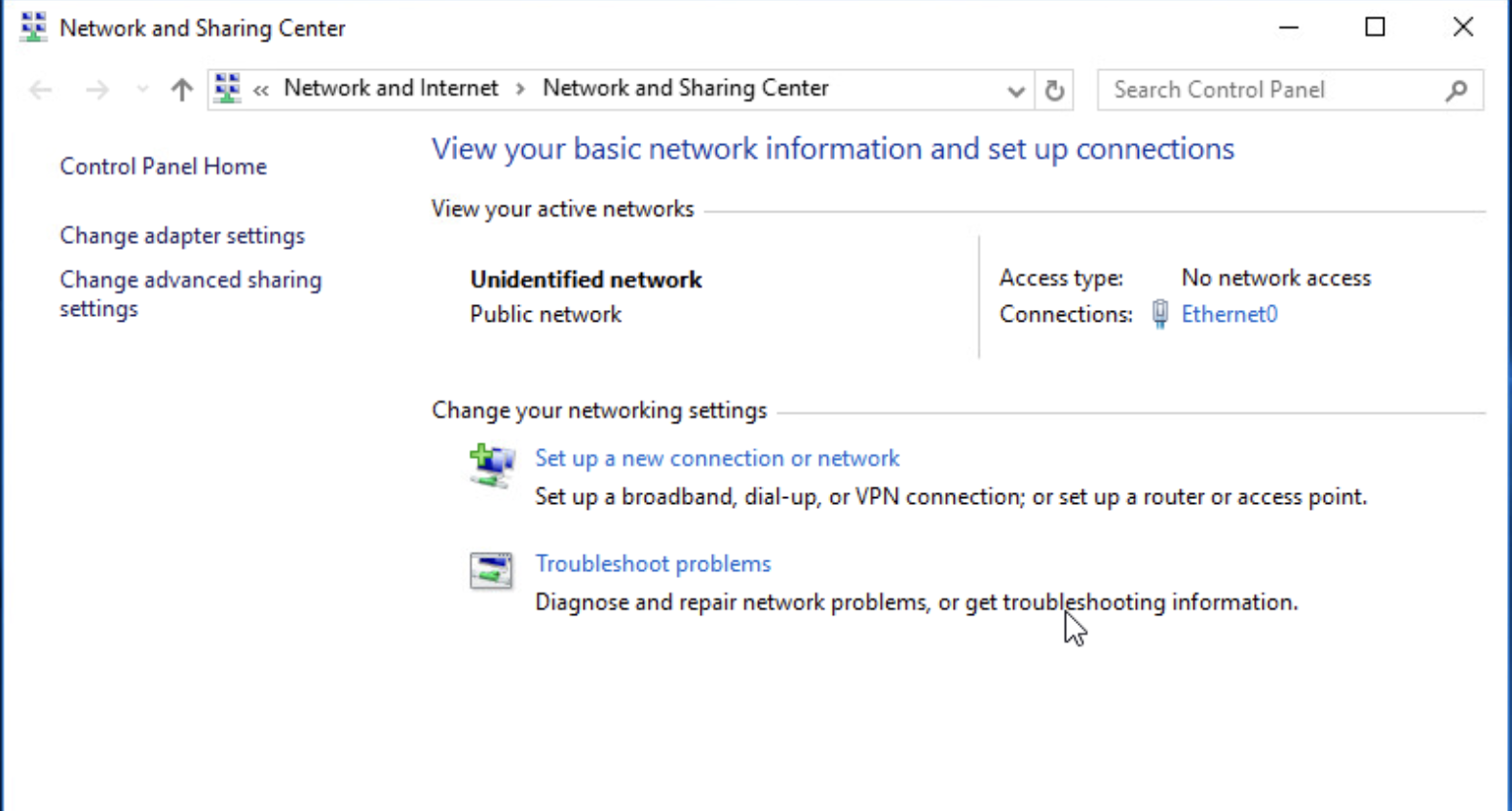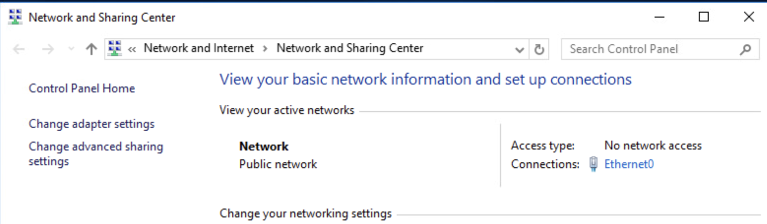 Ağ ve Paylaşım Merkezi'ni açtıktan sonra, mevcut ağ bağlantımızı yapılandırmak için 'Connections' (Bağlantılar) kısmında yazan 'Ethernet0' bağlantısına tıklıyoruz. Bu bağlantı, sunucumuzun ağ adaptörüne ait ayarları görüntülememizi ve yapılandırmamızı sağlar.