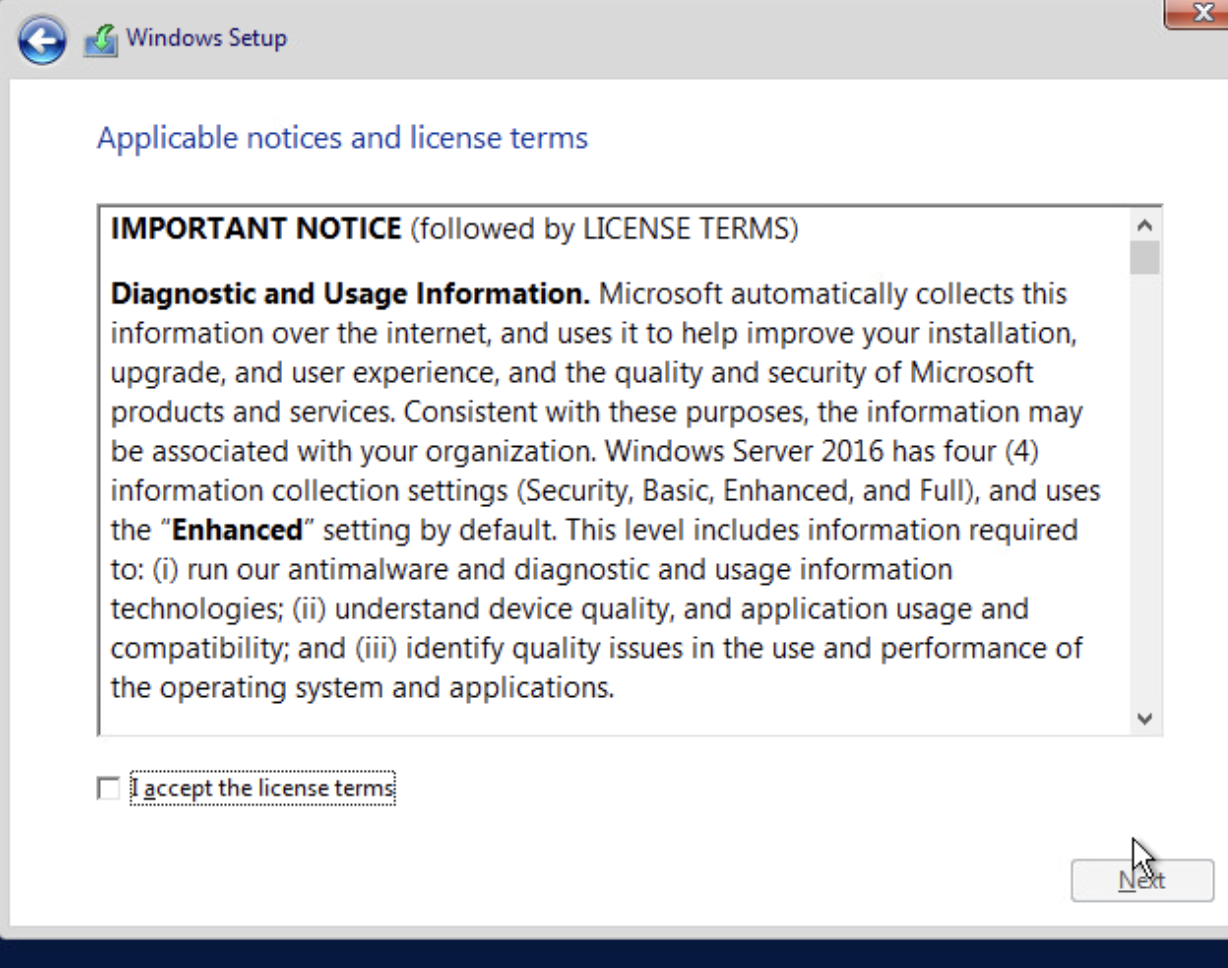 GUI seçimini yaptıktan sonra karşımıza gelen ekranda Windows Lisans Sözleşmesi'ni görüyoruz. Sözleşmeyi dikkatlice okuyup ardından 'I accept the license terms' (Lisans şartlarını kabul ediyorum) kutucuğunu işaretliyoruz. Kabul işlemini tamamladıktan sonra 'Next' butonuna tıklayarak bir sonraki adıma geçiyoruz.