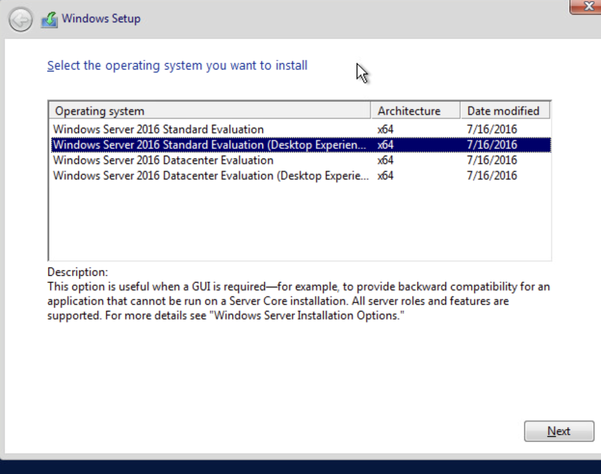 Kurulum seçenekleri ekranında 'Windows Server Standard (Desktop Experience)' yani GUI (Graphical User Interface) sürümünü seçiyoruz. GUI seçeneği, kullanıcı dostu bir arayüz sunarak işlemleri menüler ve grafiksel araçlarla yapmamıza olanak tanır. Konsol sürümünde ise yalnızca komut satırı arayüzü bulunur. Bu nedenle GUI seçimi, görsel ve menü tabanlı yönetim için önemlidir. Seçim yaptıktan sonra 'Next' butonuna tıklayarak devam ediyoruz.