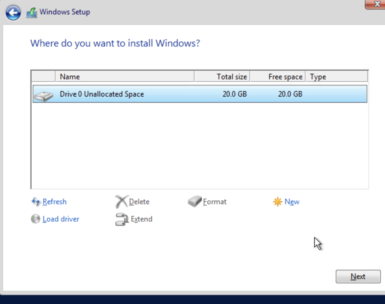 Kurulum türü seçiminden sonra disk yapılandırma ekranına geçiyoruz. Burada Windows Server'ı yükleyeceğimiz diski seçiyoruz. Eğer disk yapılandırması gerekiyorsa, yeni bölümler oluşturabilir veya mevcut bölümleri silebiliriz. Doğru diski seçtikten sonra 'Next' butonuna tıklayarak Windows Server kurulum sürecini başlatıyoruz.