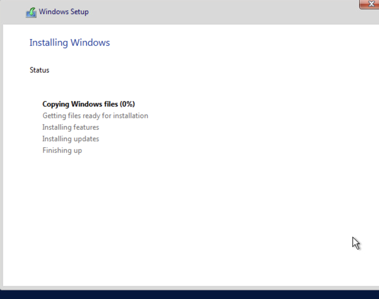 Diski seçip ilerledikten sonra Windows Server kurulum işlemi başladı. Bu süreçte dosyalar diske kopyalanır, sistem dosyaları yüklenir ve gerekli yapılandırmalar tamamlanır. Kurulumun sorunsuz tamamlanabilmesi için bu aşamada sistemi kapatmamalı veya müdahale etmemeliyiz. Kurulum tamamlandığında sunucu otomatik olarak yeniden başlatılacaktır. Şimdi sabırla işlemin tamamlanmasını bekliyoruz.