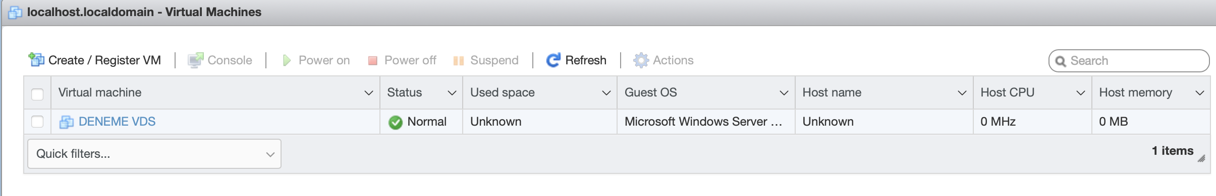ESXi arayüzünde 'Virtual Machines' bölümüne giderek 'Register VM' seçeneğine tıklıyoruz. Bu adımla yeni bir sanal sunucu oluşturma aşamasına geçiyoruz ve gerekli yapılandırmaları adım adım tamamlıyoruz.