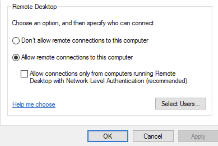 Alt kısımda bulunan 'Allow connections only from computers running Remote Desktop with Network Level Authentication (recommended)' (Yalnızca Ağ Düzeyi Kimlik Doğrulaması ile çalışan bilgisayarlardan bağlantıya izin ver) seçeneğinin işaretini kaldırıyoruz.