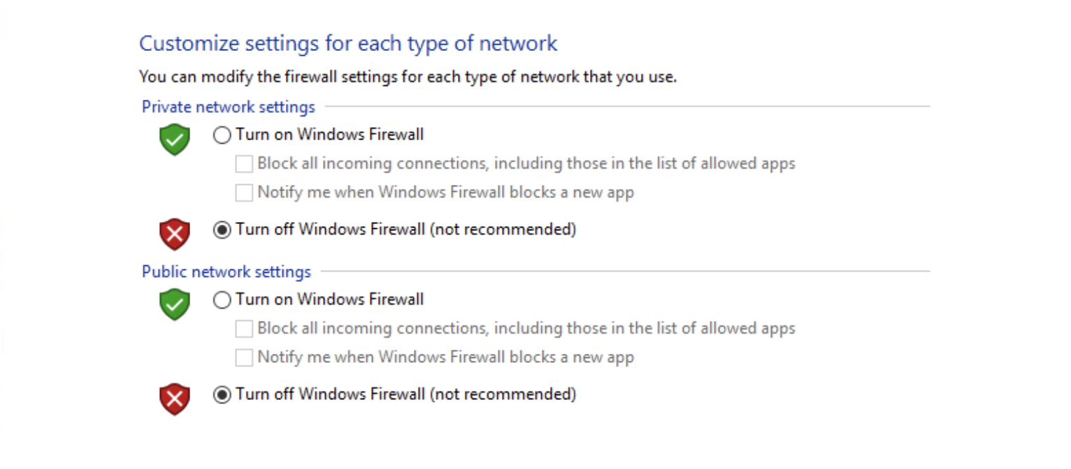 Bu üç seçenekte de 'Turn off Windows Defender Firewall' (Windows Güvenlik Duvarını Kapat) seçeneğini işaretliyoruz.